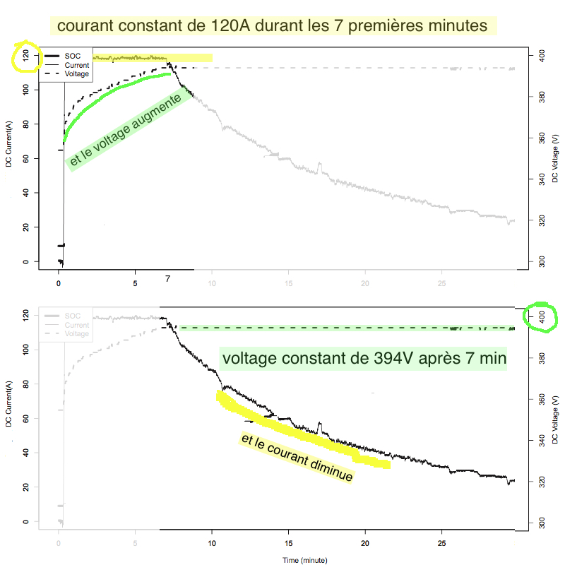 Pour convertir les puissances de ce graphique extrait de Rajagopalan et al. (2013)1 en courants de recharge, il faut diviser la puissance par la tension maximale en charge des cellules de Lithium oxyde de manganèse, 96 x 4.1V (selon les spécifications du fabricant2