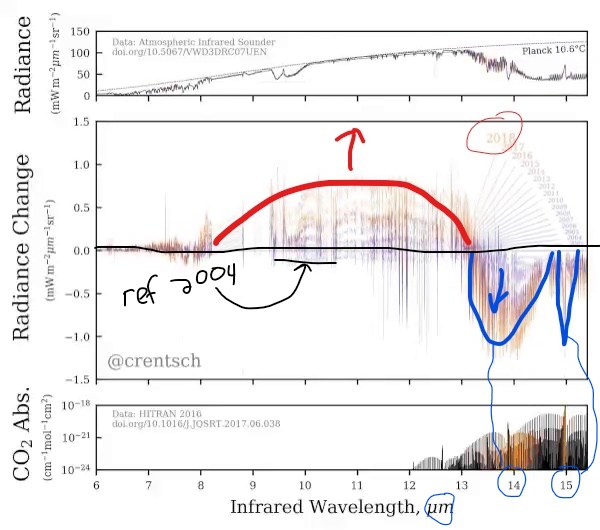 Mesures spectrales capteur vers le sol, animation d’année en année, la première année 2004 est la ligne de référence (droite horizontale) . La dernière année affichée est 2018: