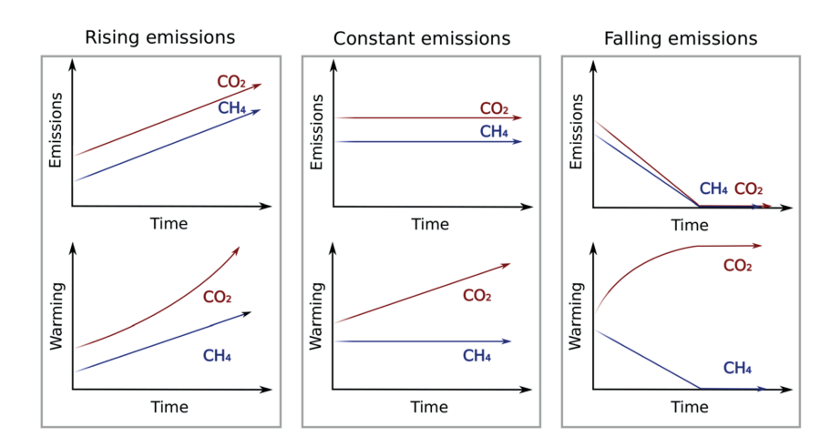 Une distinction importante doit être faite également entre le CO2 et le CH4 (méthane). Ce dernier est plus puissant mais reste moins longtemps dans l’atmosphère. Le graphique suivant illustre la distinction (warming correspond à la concentration dans l’atmosphère):