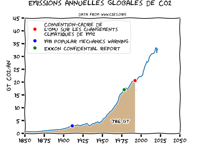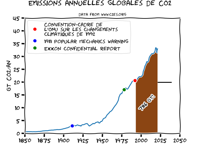 Que s’est-il passé depuis? RIEN! La désinformation des compagnies pétrolières et la veulerie de nos politiciens nous ont maintenu sur cette courbe exponentielle. Nous avons autant émis de CO2 depuis le sommet de l’ONU qu’alors depuis l’histoire de l’humanité! Et ce, malgré les connaissances alors établies.