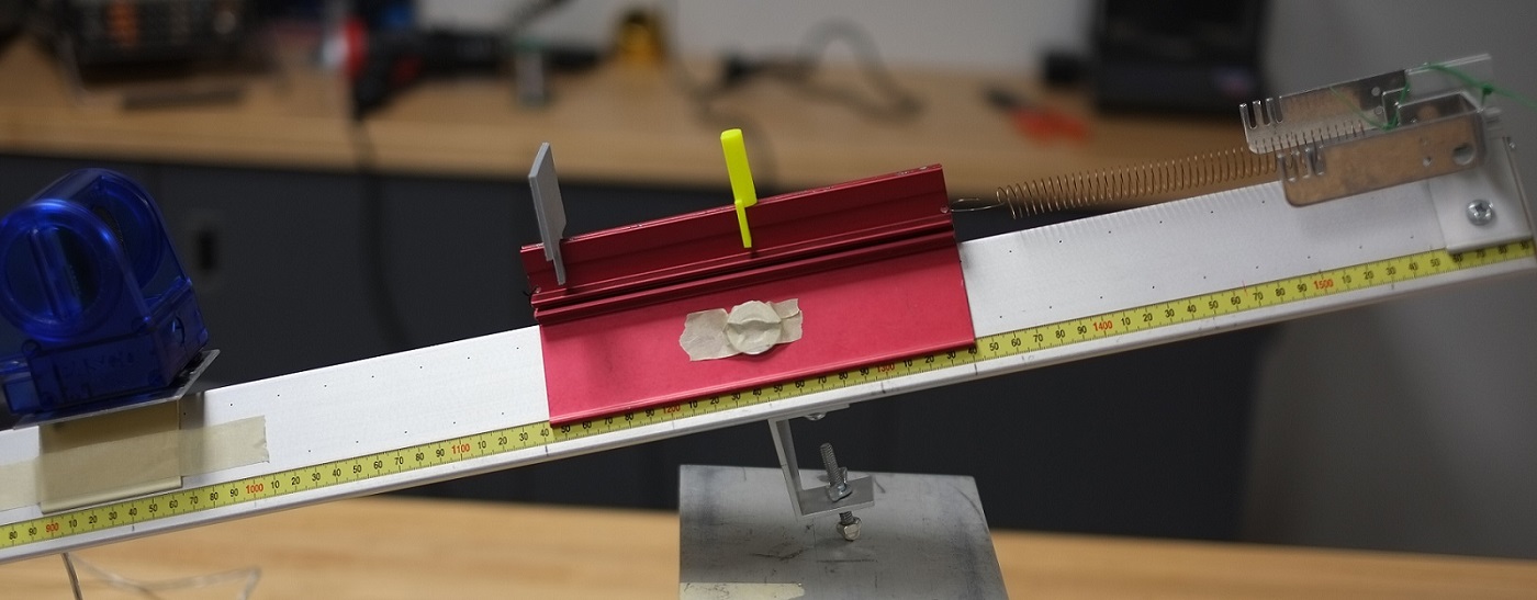 La masse oscillante sera composée d’un chariot qui se déplacera le long d’un rail incliné tout en étant retenu vers le haut avec un ressort. Vous aurez donc à calculer (dans Capstone) plusieurs sortes d’énergies: